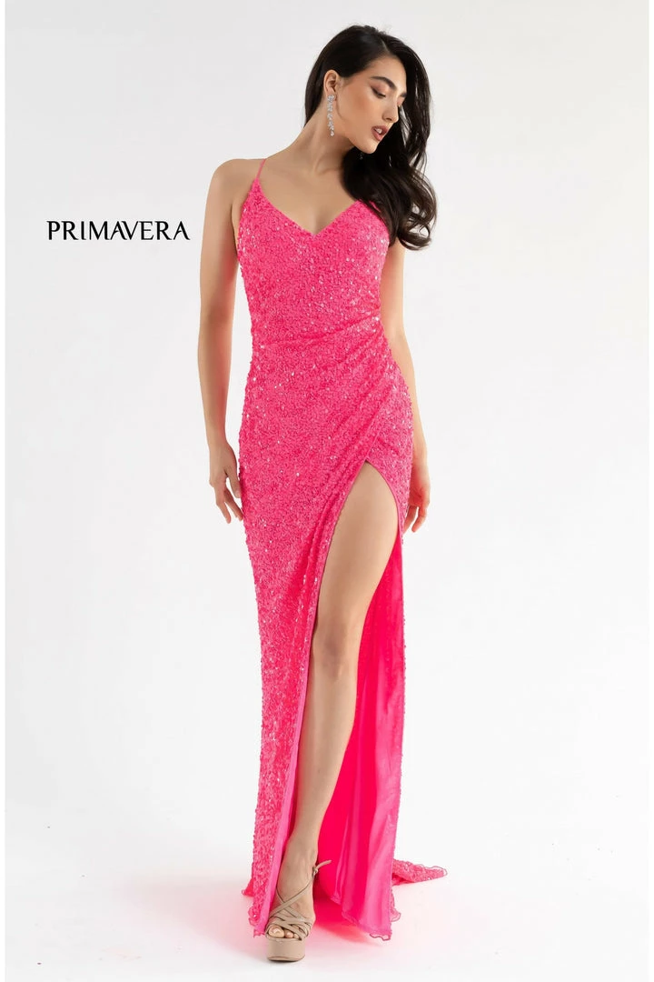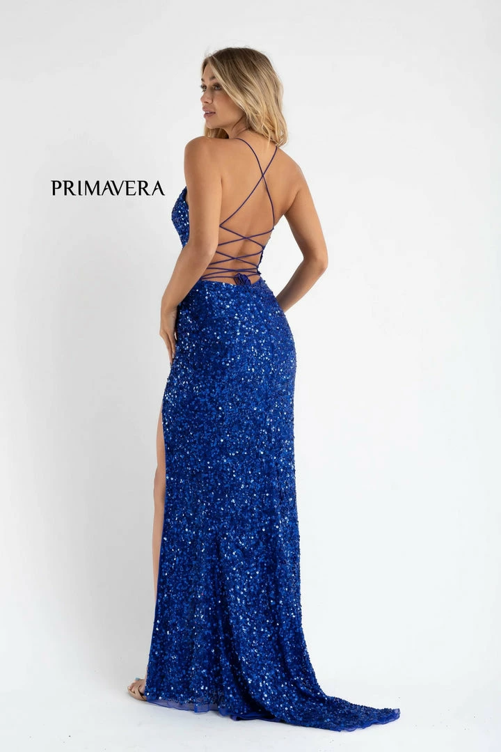 Primavera Couture 3791 Exclusive Prom Dress. This is an all sequins prom dress with a V neckline and spaghetti straps that lace up and tie in the open back. It has a wrap style side slit and a sweeping train.