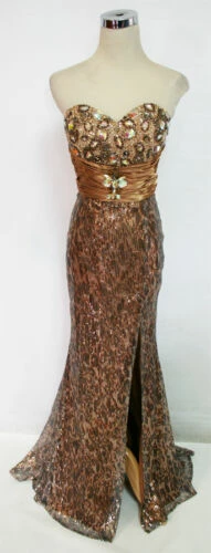 Riva Designs R9412 Size 14 Animal Print Sequin Formal Dress slit Strapless Bronze Gown detachable straps included. Cutout keyhole back.