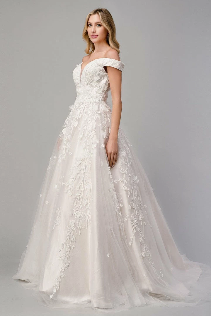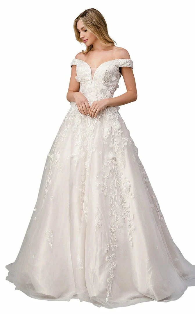 Andrea & Leo Couture PEONY A1027 Long off Shoulder Ballgown Wedding Dress Bridal Gown Peony White Gown is a layered tulle ball gown with floral diamond glitter motif trickling down the gown. 3D organza flowers add couture depth to the garment, while the off-white tone of the dress softly blends into the shimmering embellishment. The bodice features a off shoulder bodice that is fully lined mid back for bra coverage. The skirt is A-line shape with crinoline to support the silhouette.