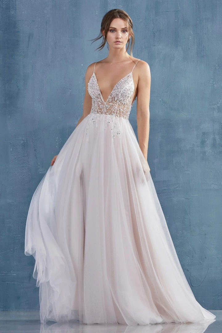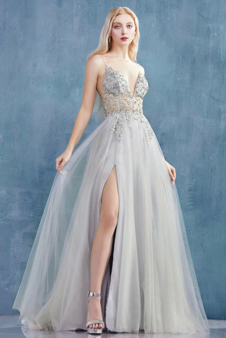 Andrea & Leo OPHELIA A0672 Long Shimmer Maxi Slit Sheer Formal Dress A Line Beaded Sexy, light, and ethereal, this gown has been a go-to gown for a wearer looking for something special but effortless. Floral beading falls flatteringly in sexy V-front and flares weightlessly at the tulle skirt with a leg slit. Double maxi slit skirt with multi collor tulle layers. Sheer V neckline with hand beaded accents.