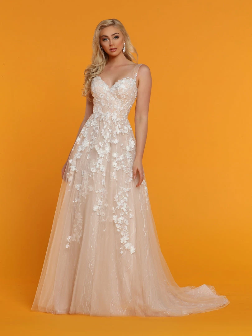 Davinci Bridal 50513 Tulle & Lace Fit & Flare Wedding Dress features a Floral Lace Bodice with V-Neckline, Sheer Lace Wideset Straps, Sheer Lace Back with Covered Buttons & Beaded Waistband. Scalloped Lace Fit & Flare Skirt finishes with a Chapel Train. Available For 1-2 Week Delivery!!!