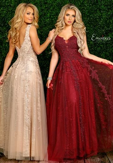 Envious Couture E1543 V neckline beaded applique and lace A line prom dress evening gown with tulle skirt and lace streaming down to the floor length dress.Â
