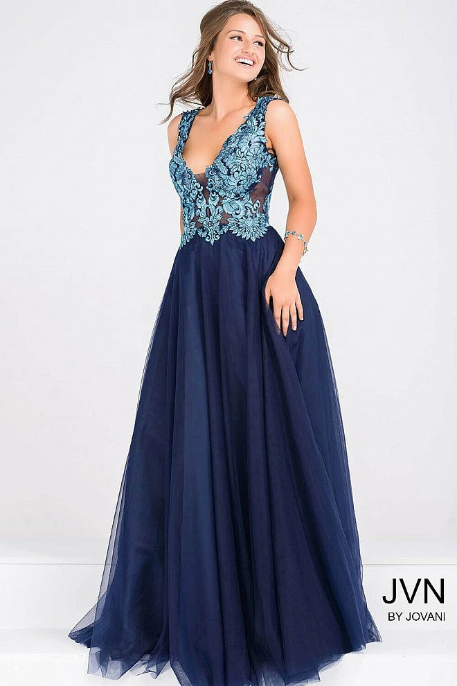 JVN48647 This is a long ballgown with sleeveless v neckline applique bodice. JVN 48647