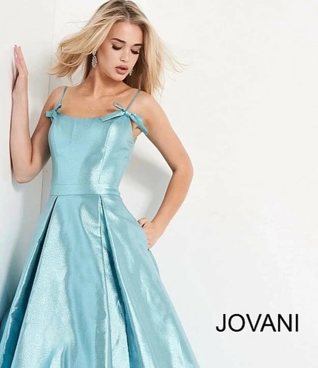 Jovani JVN03479 Blue Metallic Prom Dress Ballgown Spaghetti Straps with Bows. This JVN by Jovani JVN03479 formal dress features a metallic A-line silhouette with a shallow scoop neckline and spaghetti straps with dainty bows. A set-on waistband tops the pleated skirt, finished with in-seam pockets and a sweeping train. Perfect for Prom, Pageant, Spring Formal or other formal events.