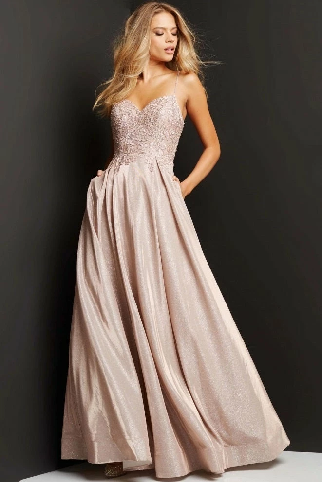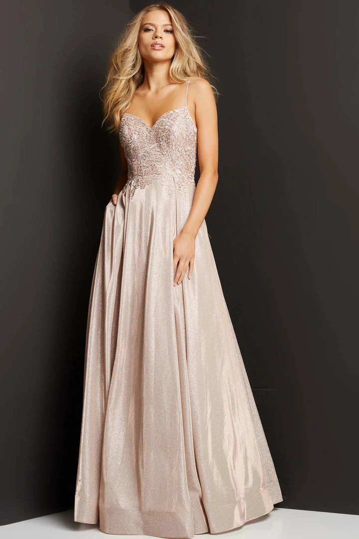 Jovani JVN 06731 A Line Shimmer Floral Lace Prom Dress Pockets V Neck Gown