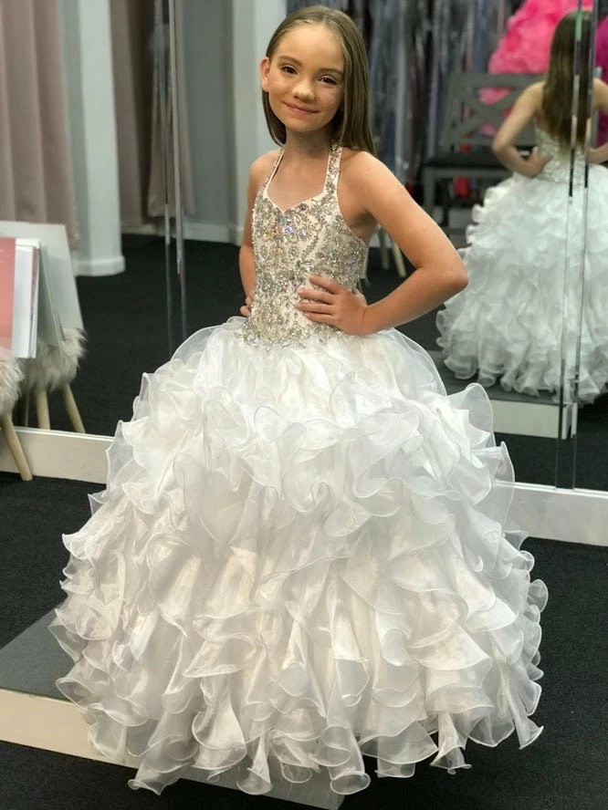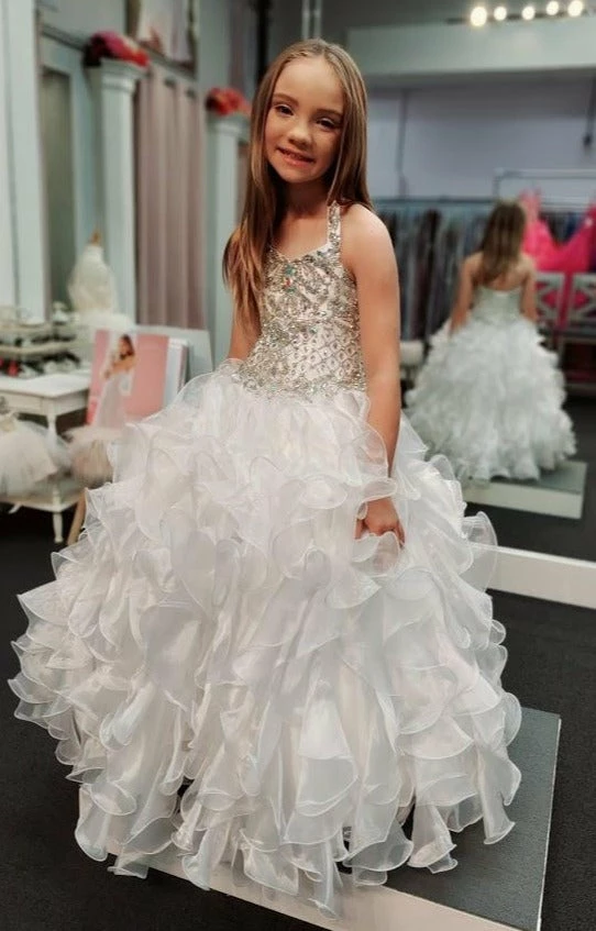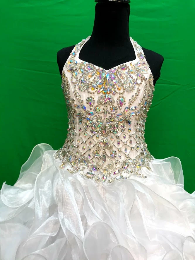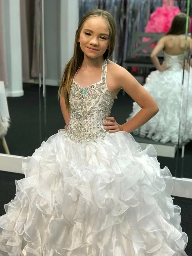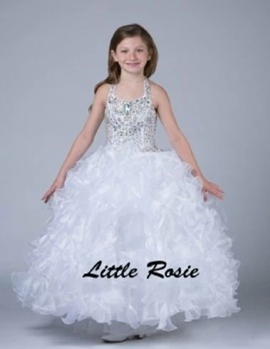 Little Rosie LR2081 is a stunning Lush Girls Glitz Pageant Gown. This Halter Neckline dress features a fully Embellished Glitz Bodice with AB Crystal Rhinestones Scattered throughout in a detailed beaded pattern. Lush Ballgown Skirt has vertical layered ruffles & no crinoline is needed! Great Formal Evening Pageant Gown. Lace up corset back with panel. Winning Pageant Dress!