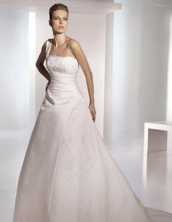 San Patrick Wedding gown by Pronovias style is Eslava size 2 in Ivory. One shoulder royal satin A line gown with a scallop lace trim at the bust. Wedding Dress Bridal Gown![]()