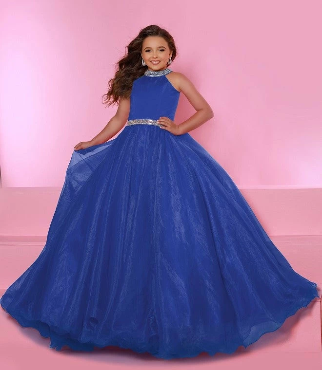 Sugar Kayne C114 by Johnathan Kayne is an Organza Girls A Line Pageant Dress. Featuring a satin lining this high neckline is Embellished with crystal rhinestone accents. The waist line is broken with a crystal bling belt. The lush Ball gown skirt features a horse hair trim. Glide across the stage in the classic beauty!