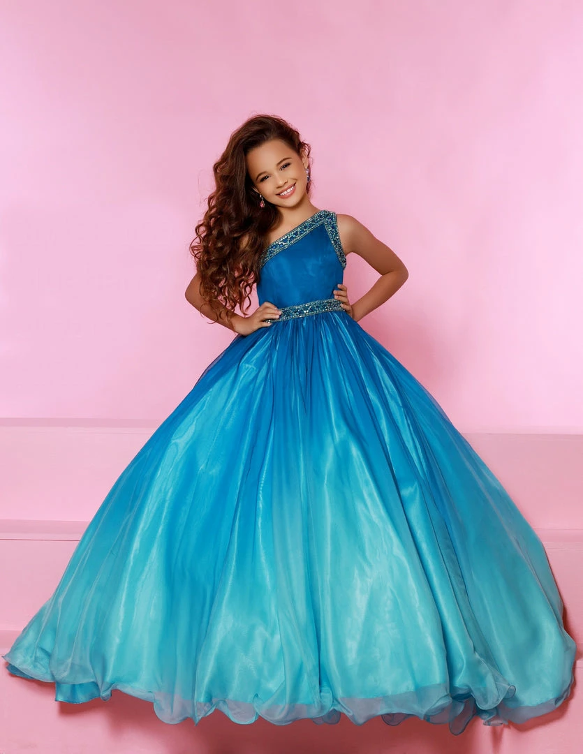 Sugar Kayne C169 is a long Ombre Girls Pageant Dress. Featuring an embellished one shoulder design. The material is Ombre Chiffon.
