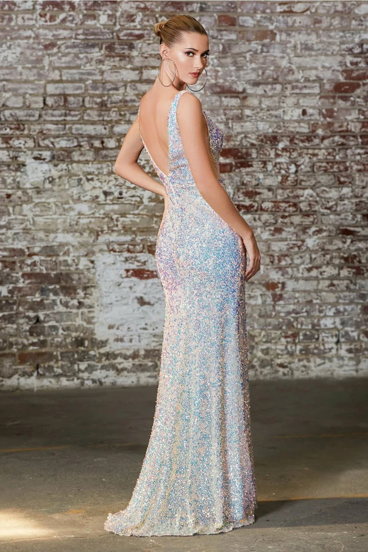 CD 187 Size 6, 8 Long Fitted Sequin Prom Dress with a high Slit. This Formal Gown ha a V Neckline sheer cutout mesh side panels for a comfortable wear. This Pageant dress is major WOW factor!