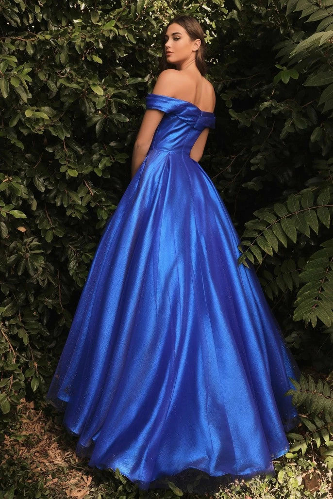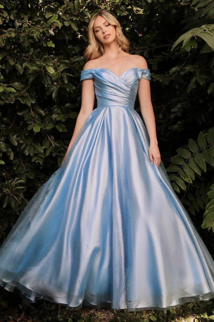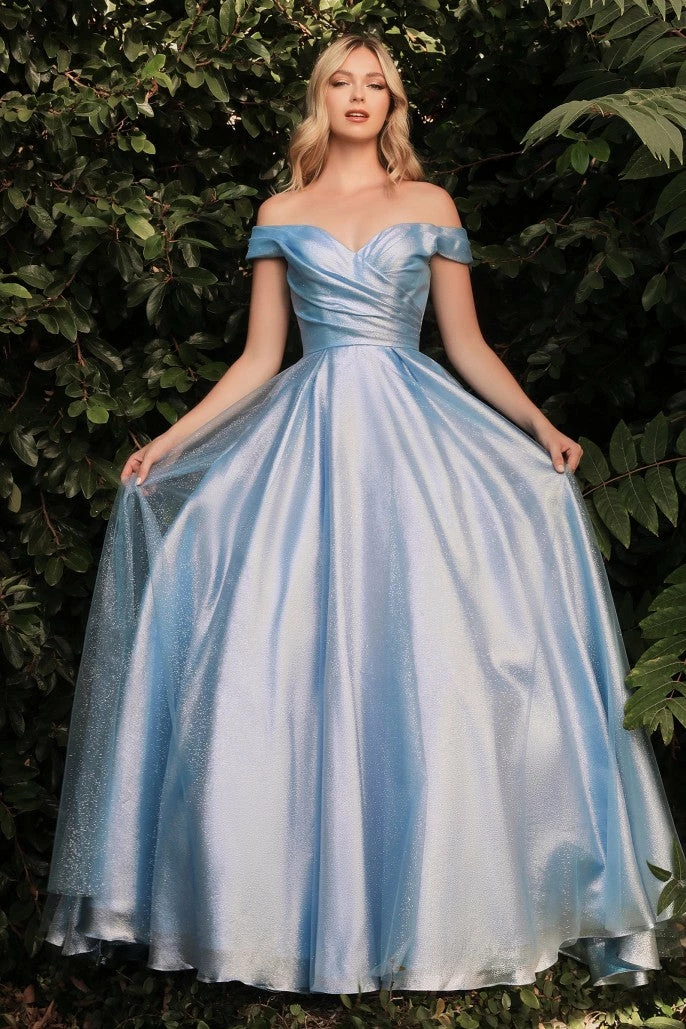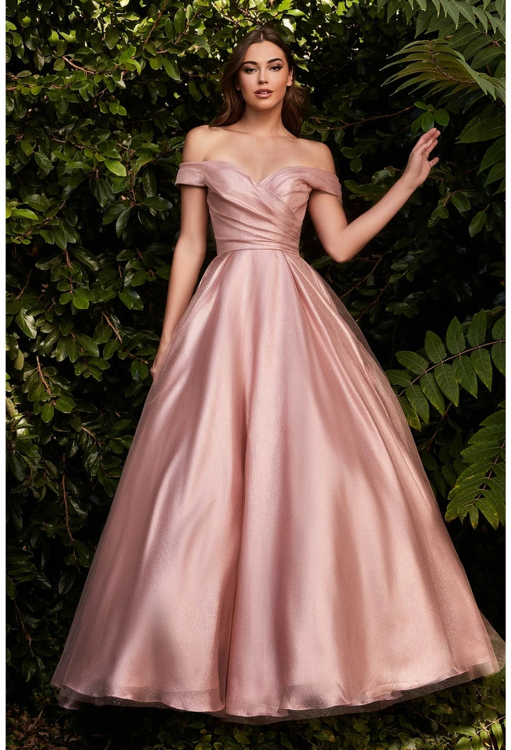 CD 823 Size 4 Long Shimmer off the Shoulder Ballgown Formal Dress Cinderella Gown Beam in this ball gown beauty. With an off the shoulder neckline the sweetheart cut has a fitted gathered bodice and full layered skirt. The glitter metallic organza illuminates in direct light.