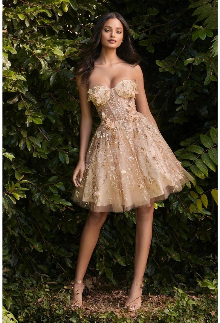 CD 9243 Short A Line fit & Flare Formal Cocktail Dress with scattered 3D Flower accents and Glitter over the Sheer Corset bodice. Cocktail Dress Fairytale Gown