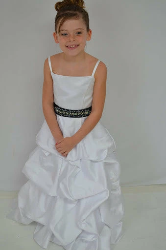 This beautiful flower girl dress is style GSF 3001.  It has a halter spaghetti strap top and pick up bottoms and come with sash.  Available in White. Sash colors vary.  Call for color availability.