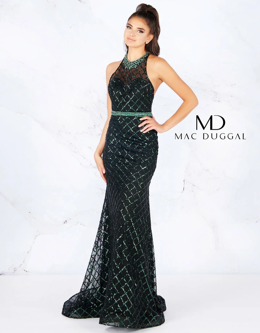 Chain link style sequin pattern gives a sense of cutting edge vibe in this evening gown. The tone on tone beading at the waist and neckline complete the full glam look. Prom Dress Pageant Gown