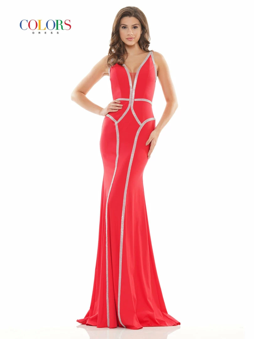 Colors 2696 Long Fitted Crystal Embellished V Neck Prom Dress Pageant GownΒ