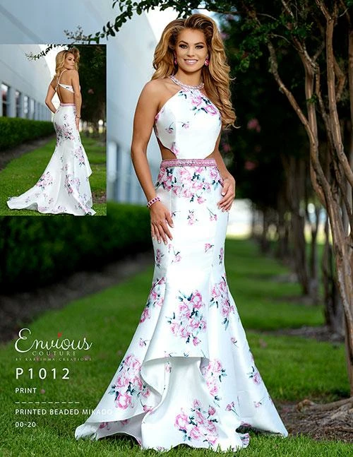 Envious Couture 1012 is a white & Floral Print Long Mermaid Prom Dress with side cutouts and a ruffle trumpet skirt.