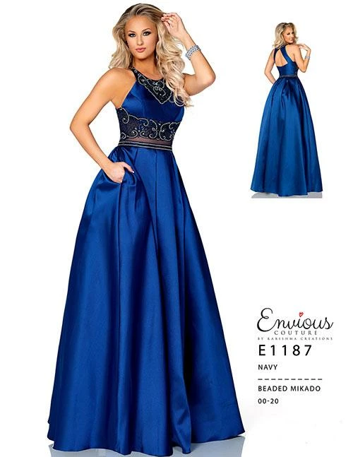 Envious Couture E1187 Long Ballgown Formal Prom Dress with pockets in the A Line skirt sheer embellished high neckline
