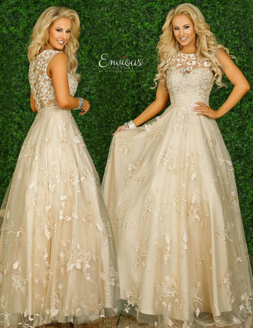 Envious Couture E1407 Karishma Creations is a Embroidered & Embellished Tulle Ballgown with a sheer high neckline with a sweetheart silhouette neckline. Sheer embroidered back. Plus sized prom dress, evening gown, formal long dress.Â