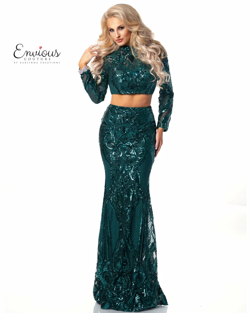 Envious Couture E1463 is a two piece Prom Dress, Pageant Gown & Formal Evening Wear. This Formal Evening Dress is a two piece long sleeve sequin fitted prom dress evening gown. 1463 Perfect for Plus Size Holiday Party Dress E 1463