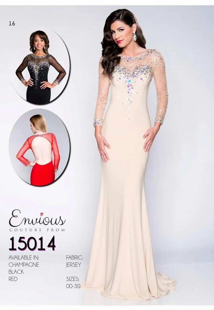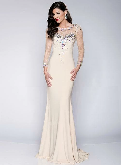Envious Couture 15014 size 00 Champagne long embellished sleeves prom dress is perfect for your special formal event. Features a sheer neckline and sleeves that are scattered with crystals and a smooth fitted jersey long skirt. Formal Dress Evening Gown