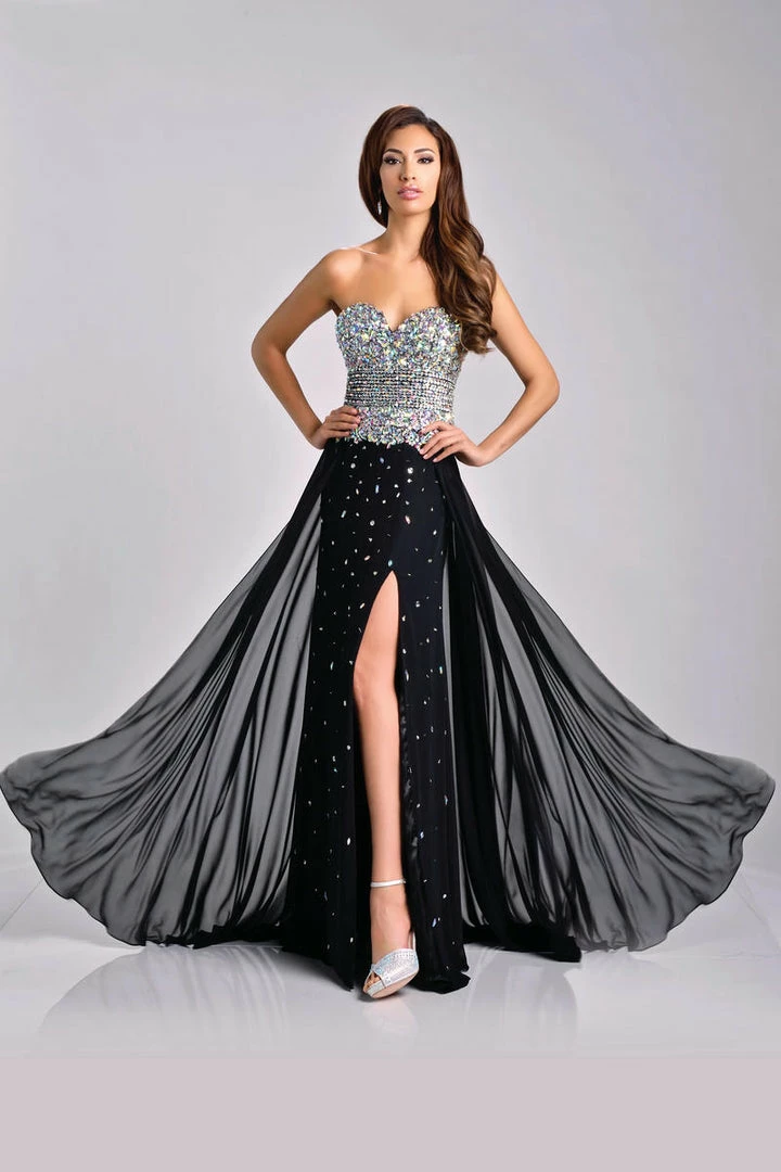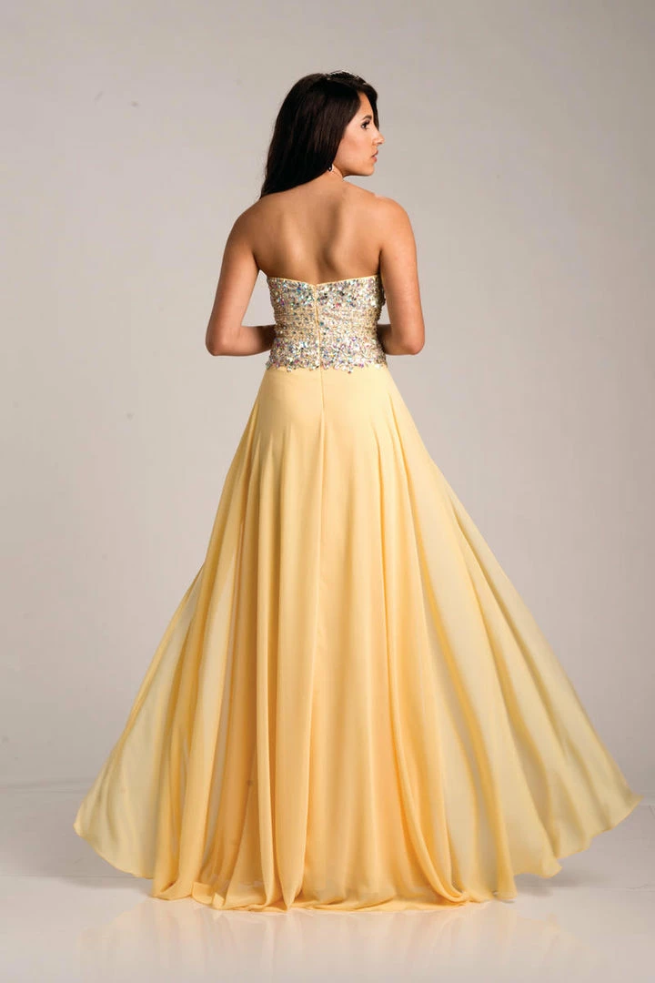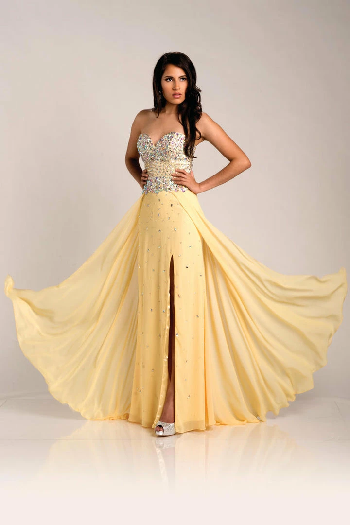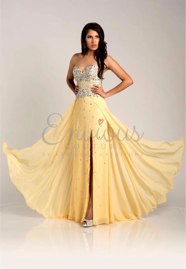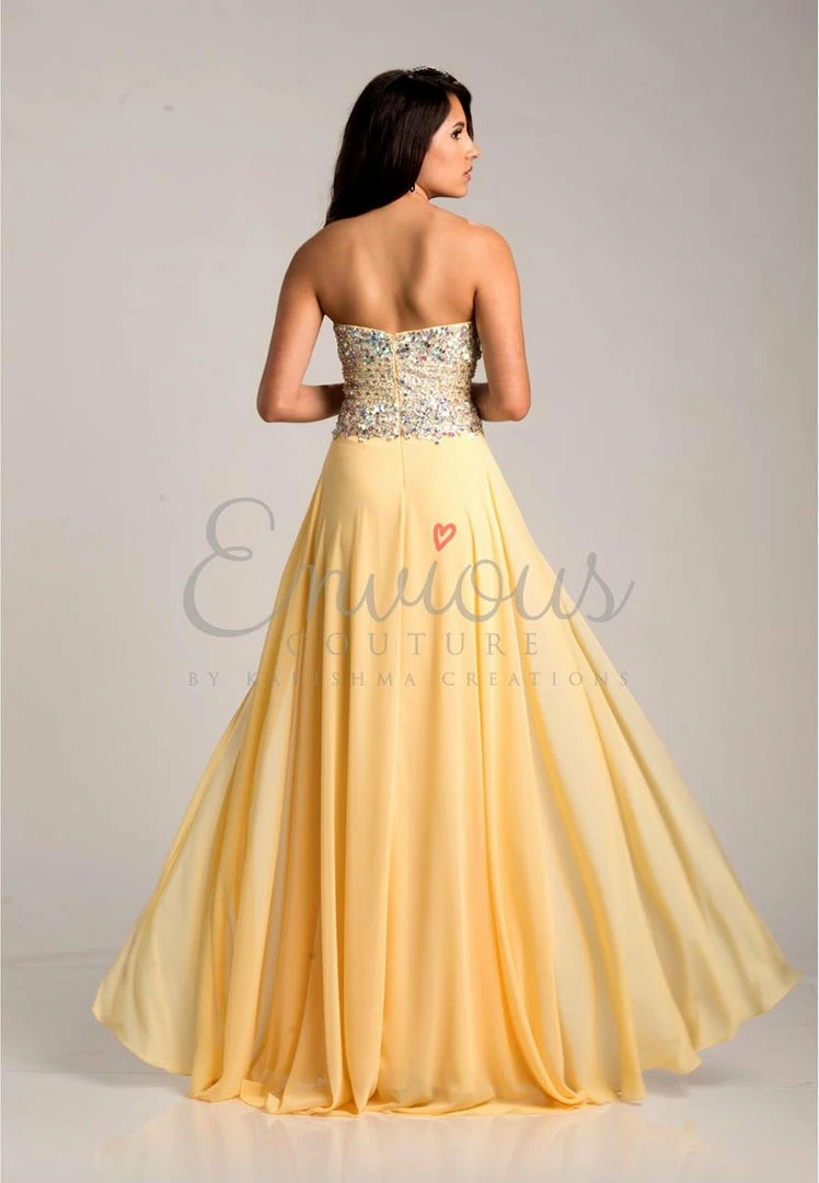 Envious Couture 15211 yellow sizes 0, 2, 16 embellished sweetheart neckline flowy chiffon A line prom dress with side slit evening gown pageant gown