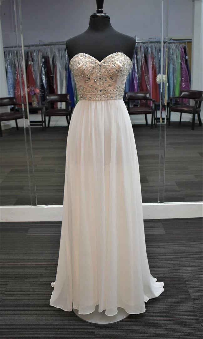 Envious Couture 16070Â Â Nude embellished sweetheart neckline bodice with flowy chiffon white skirt perfect for informal wedding or your prom dress.Â