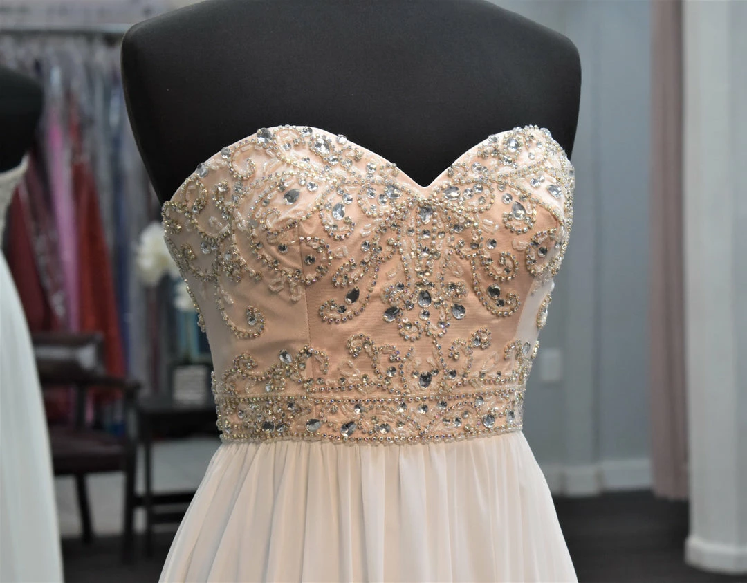 Nude embellished sweetheart neckline bodice with flowy chiffon white skirt perfect for informal wedding or your prom dress.Â