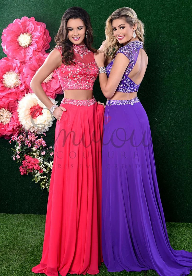 Envious Couture 17033 Two piece dress with sheer high collar neckline embellished and chiffon skirt with pockets!