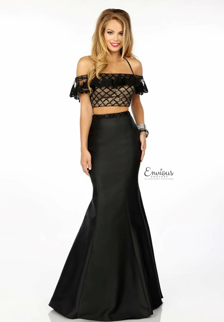 Envious Couture by Karishma Creations 18065 two piece off the shoulder prom dress in Black. Featuring an off the shoulder lace sequin bodice with a fit & Flare mermaid skirt.