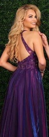 Envious Couture E1421 is a Long Iridescent Eggplant Purple Prom Dress, Featuring a sweetheart Neckline under a sheer high neckline with Embellished appliques. Open Mid rise back with sheer Embellished straps. Skirt features an Iridescent Shimmer Fabric with a side slit for that Exquisite shine at any Event! E 1421
