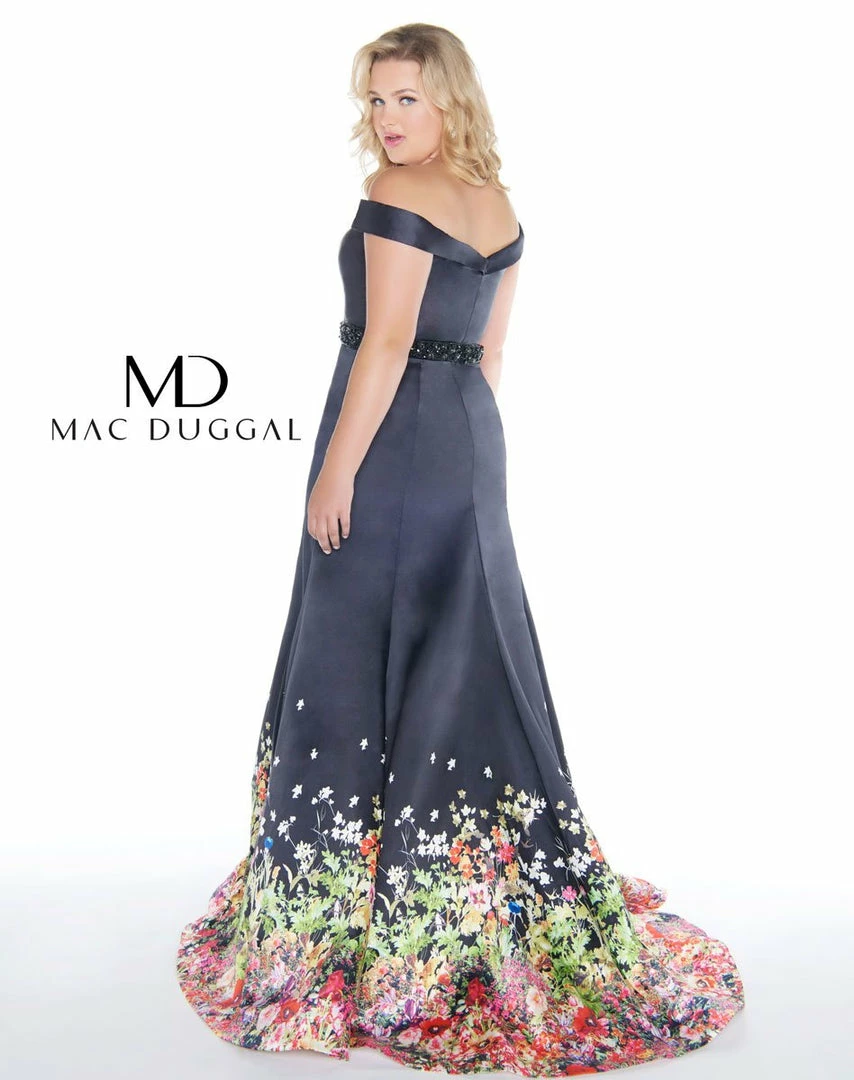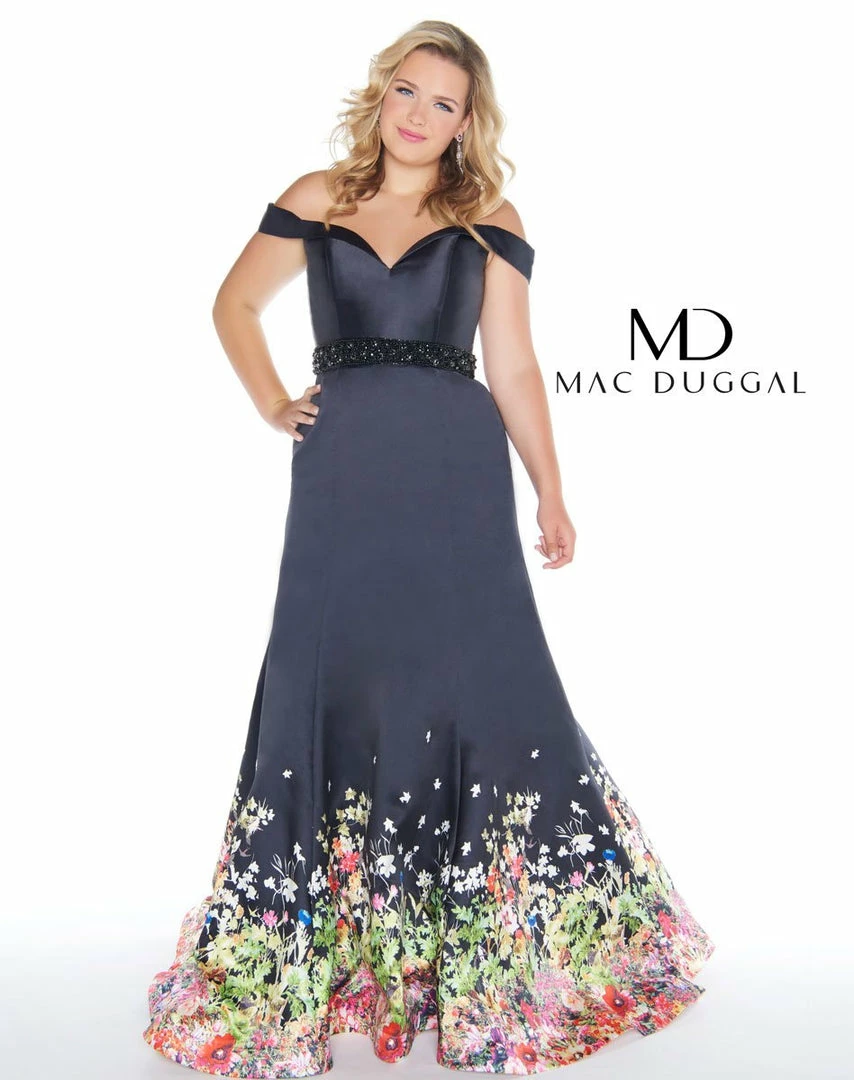 Off the shoulder plus size prom dress with floral detail on the hemline