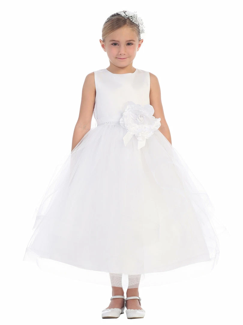 Girls Tea Length Flower Girl Dress featuring a high neck satin bodice with a tulle layered skirt with horse hair trim. Sash With floral Bow accent. Perfect for your little flower girl! 5661