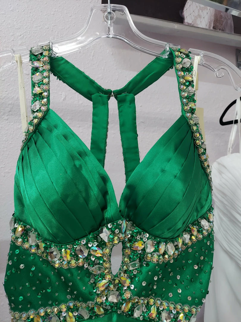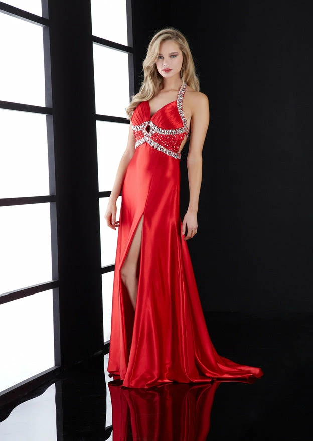 Beautiful bead trimmed prom dress with pleated bodice with center keyhole cutout, beaded straps and stunning low-back featuring a waterfall train.