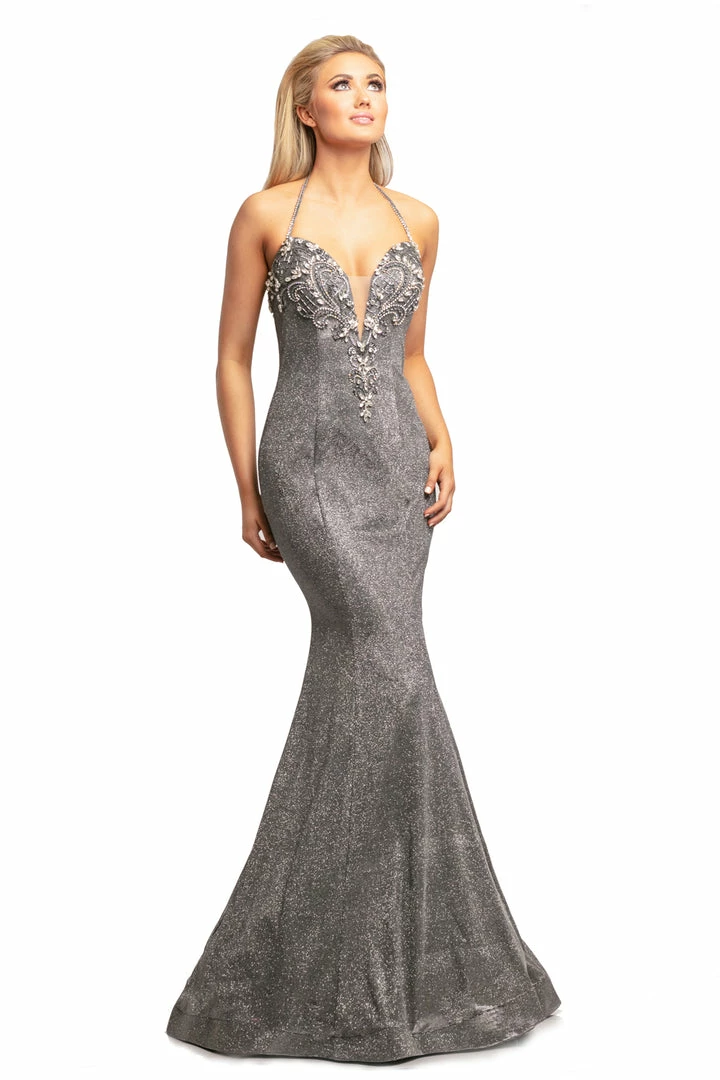 Sweetheart Plunging neckline with mesh insert. Detail Beading & Crystal Embellishments along the bust cascading down the bodice. Open Back with Corset Closure adds a classic touch. Embellishments along the corset back. This Dress changes colors in different light!