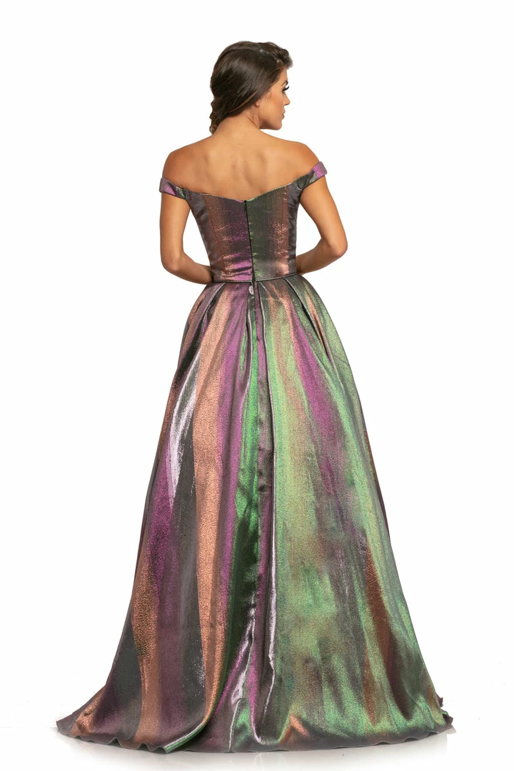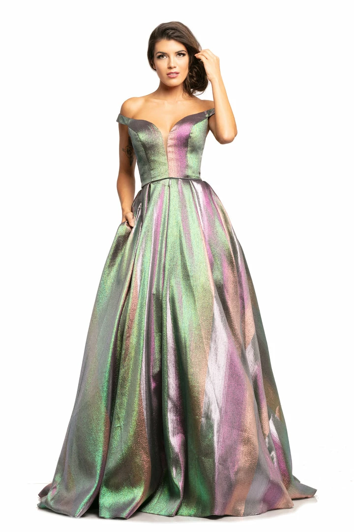 Johnathan Kayne 2019 is a Magical Gown. Get Glam Vibes with this Iridescent Metallic Shimmer Brocade Fabric & Romantic off the shoulder straps and Plunging Neckline. Did someone say unicorn affect!? The off-the-shoulder sweetheart bodice mixed with this beautiful metallic brocade is giving all the unicorn-ombre vibes that you need.