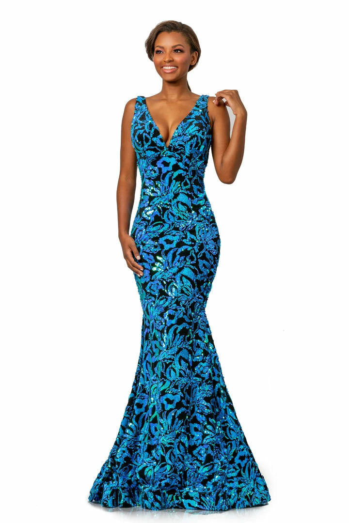 This Long Fitted Mermaid Dress Features a Stretch Velvet with Floral Iridescent Sequin Embellishments along the entire dress. Deep V Neckline. with open V Back. Fit & Flare Silhouette with a Lush Trumpet Skirt. This Gown is Stunning!