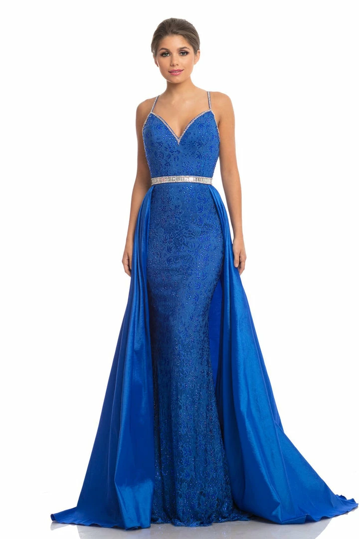 Johnathan Kayne 7242 is a lace Prom Dress, Pageant Gown & Formal Evening Wear. The structured bodice of this A/B crystal adorned stretch lace gown offers excellent, supportive construction. The column skirt falls over the hip and is framed by the dramatic taffeta hostess skirt that flows around the body.