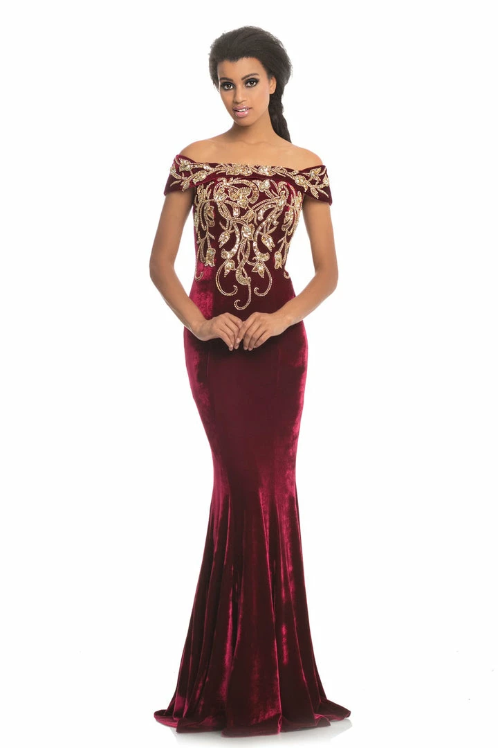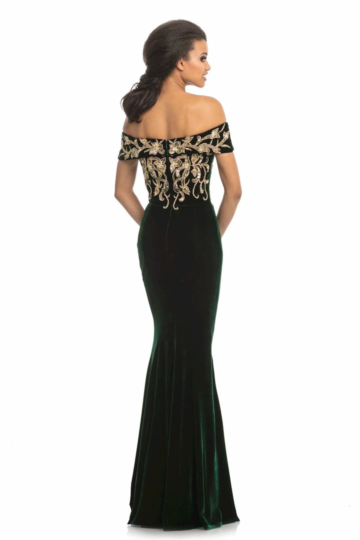 Johnathan Kayne 9076Â This elegant stretch velvet gown is dramatically embellished with luxurious gold lace applique and crystals. The off the shoulder bodice flatters everyone and the full back offers supportive coverage.