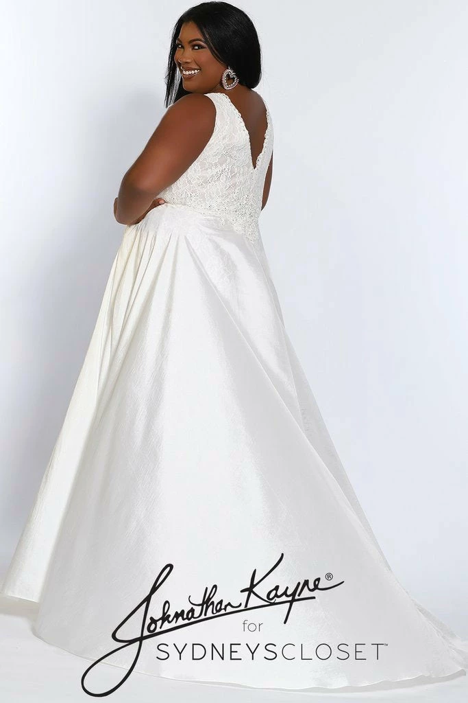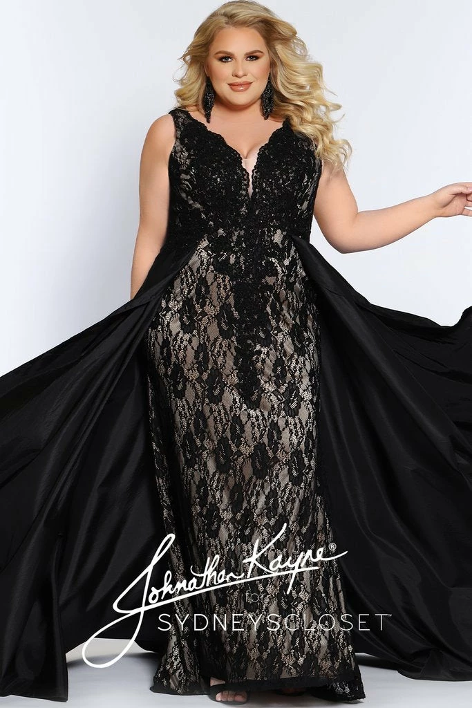 Johnathan Kayne for Sydney’s Closet JK2016 Stingray halter neckline fitted lace plus size prom dress with flowy chiffon over skirt Stingray Dress