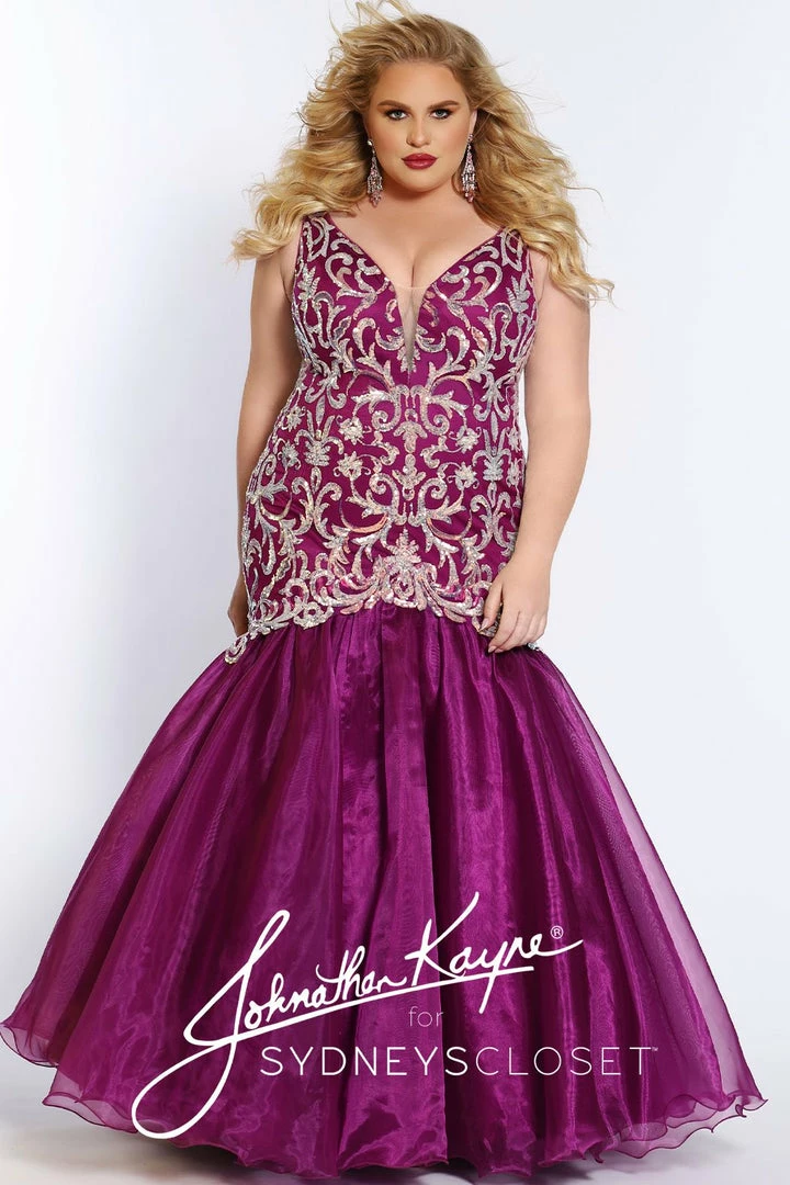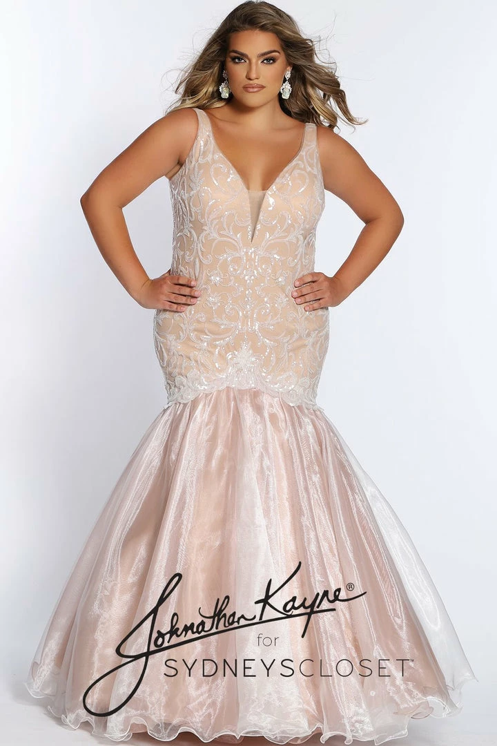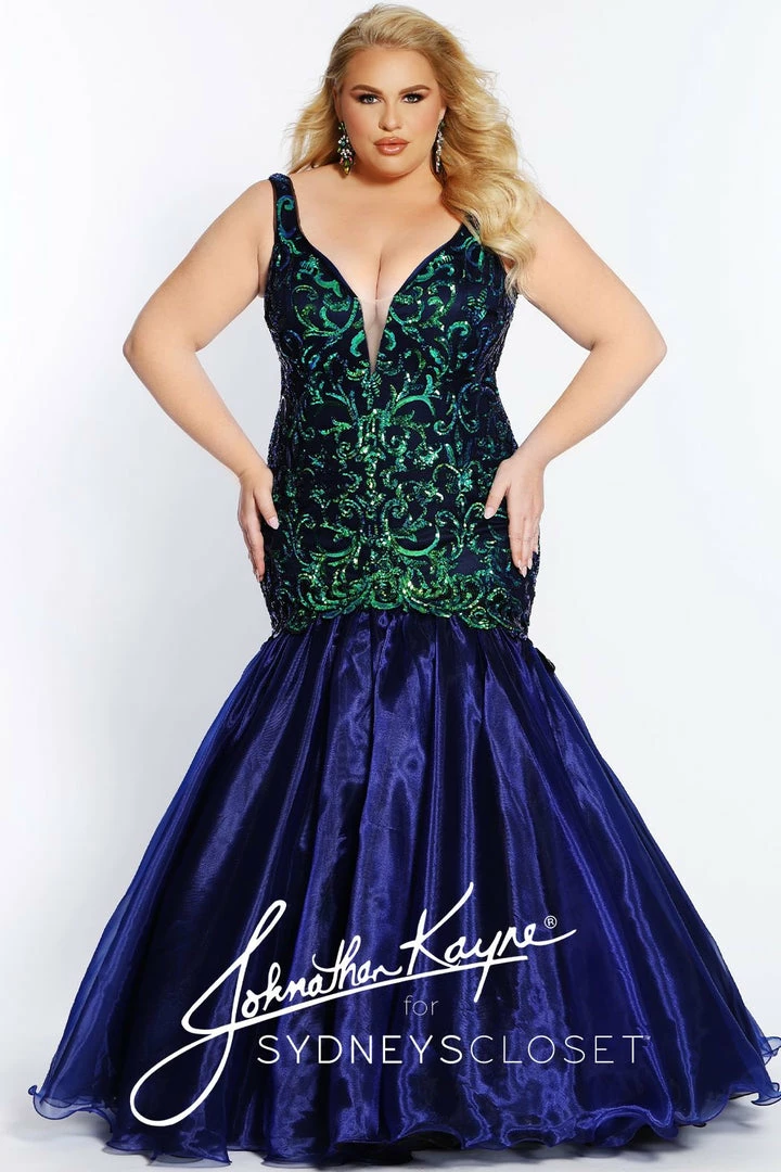 Johnathan Kayne for Sydney’s Closet JK 2101 Hurricane This is an amazing long plus sized mermaid prom dress with a plunging v neckline with a corset back.Β It is embellished sequin embroidery throughout past the hips with a full fit and flare mermaid shiny organza skirt that includes a sweeping train.Β