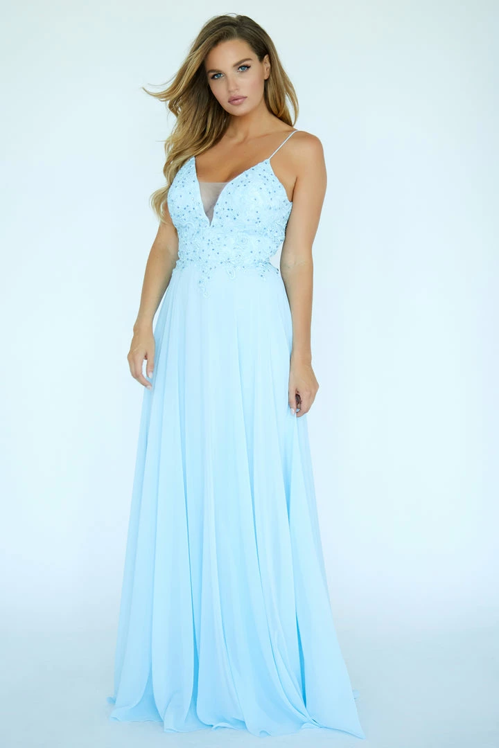 Jolene Exclusive E20001 & E20001L is a Long Floral embroidered applique bodice with embellishments. Featuring a plunging V Neckione with spaghetti straps. Flowing chiffon skirt. Open V Back.