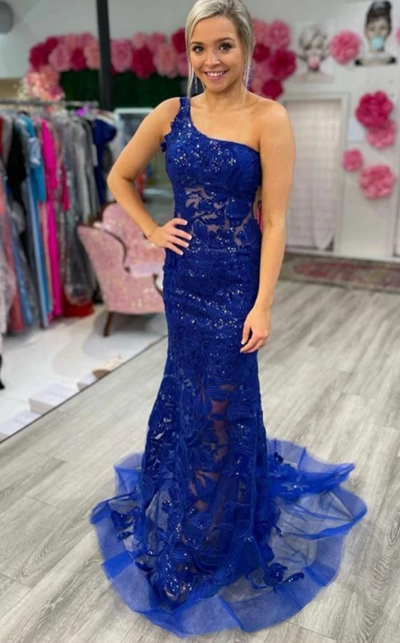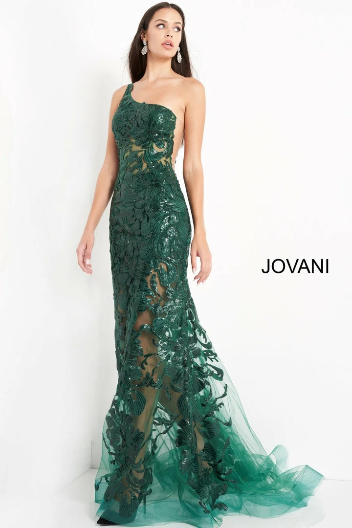 Jovani 02895 is a long fitted one shoulder formal prom dress. Featuring a sheer fitted bodice and skirt. Sequin embellished lace appliques. Mermaid silhouette. sheer side panels with mesh insert. sweeping train with horse hair trim. Great Prom & Pageant Dress.