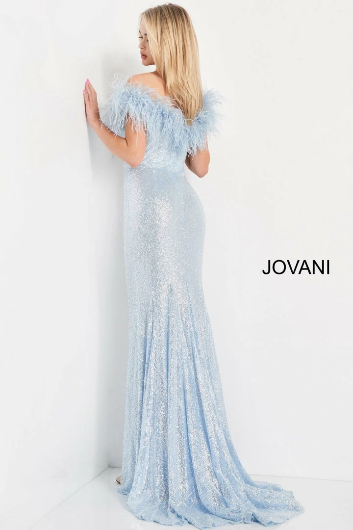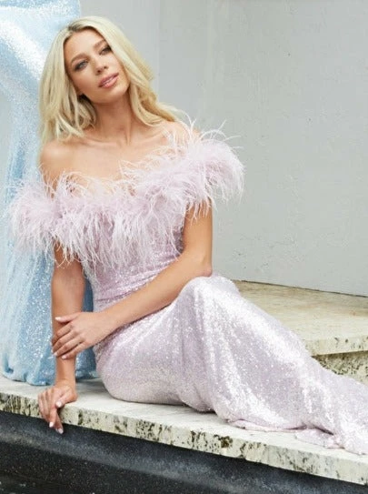 Jovani 06166 is a Long Fitted Sequin Formal Evening Gown. Featuring a Lush Feather Accented sweetheart neckline & off the shoulder straps. This Fit & Flare Pageant & Prom Dress has a stunning sequin sweeping train. Great for any Formal Event!