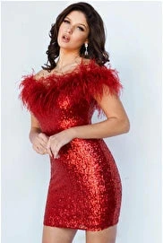 Jovani 06167 is a short fitted sequin cocktail evening dress. Featuring a straight neckline with off the shoulder feather embellished straps. Fitted Stretch Sequin bodice is perfect for any formal event or occasion! Sexy wedding reception dress in Ivory or Little black dress.