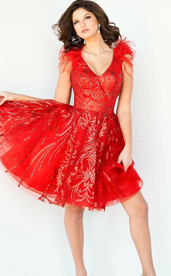 Jovani 09466 Short Fit & Flare Red Feather Embellished Cocktail Dress Formal Glitter V Neck Gown