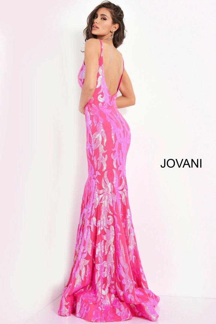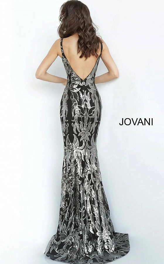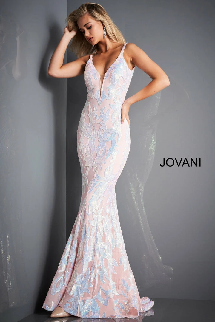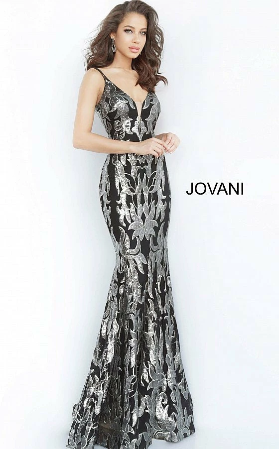 Jovani 3263 is a long Fitted Mermaid Prom Dress with a damask print sequin embellished pattern. Plunging V Neckline and open V Back. Lush Trumpet Skirt is great for the stage in this formal evening gown & Pageant Dress. wedding dress