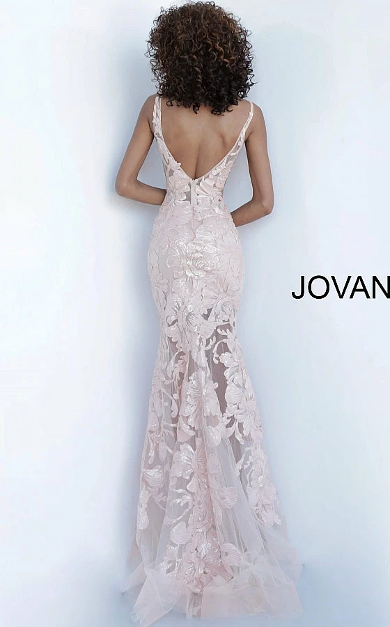 Jovani 60283 Plunging Neckline Prom Dress 60283 Evening gown Sheer mesh, sequin flower appliques, form fitting silhouette, floor length, sleeveless bodice, plunging V neck, V back, sheer mesh inserts on the sides.