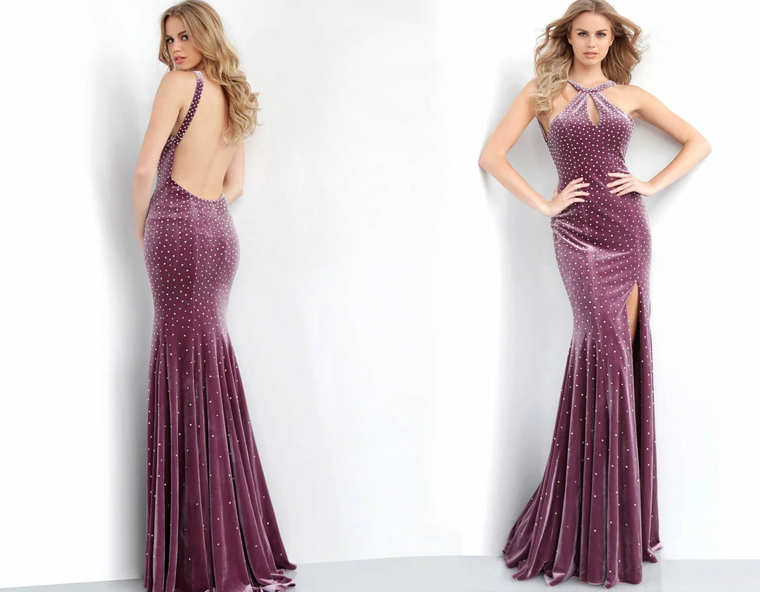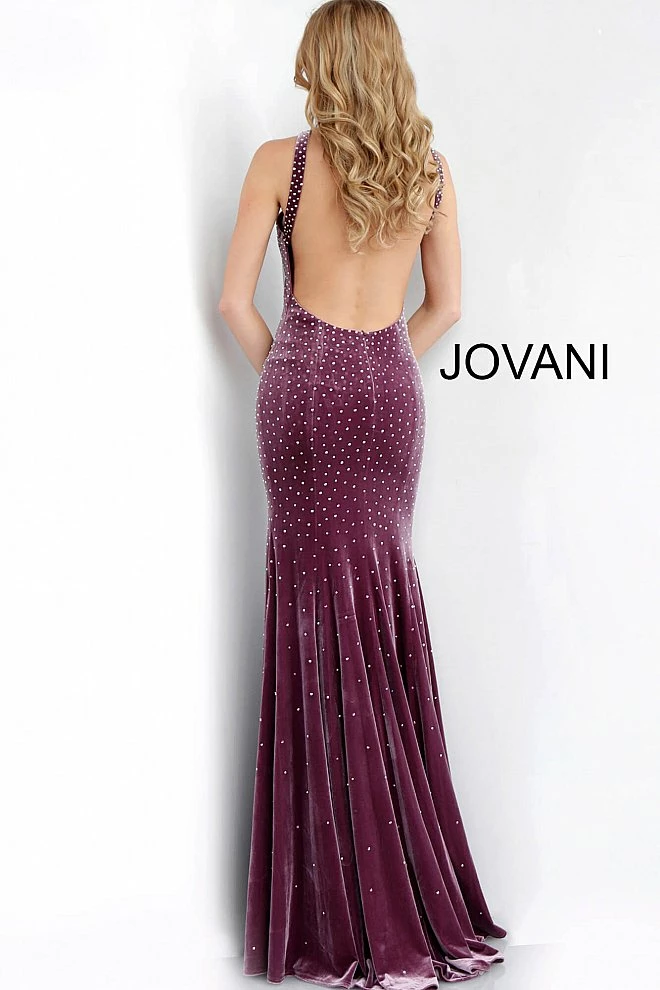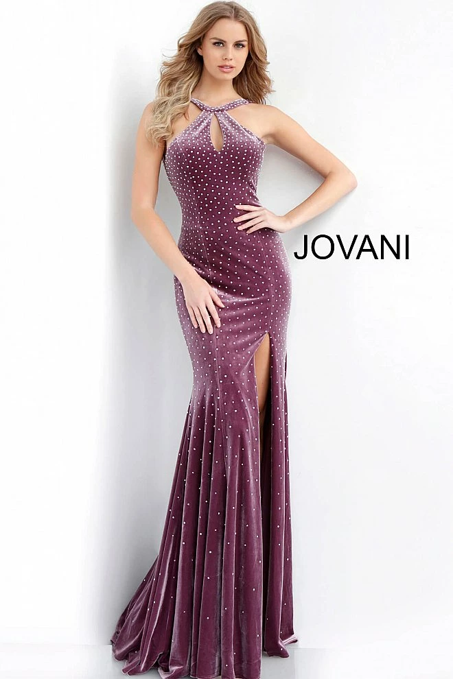 Jovani 63935 Mauve Size 0 Mauve velvet fitted prom dress featuring heat set stones with a high neckline, keyhole sleeveless bodice and open back, floor-length fitted skirt with flared end and side high slit. Prom Dress Pageant Gown Evening DressÂ