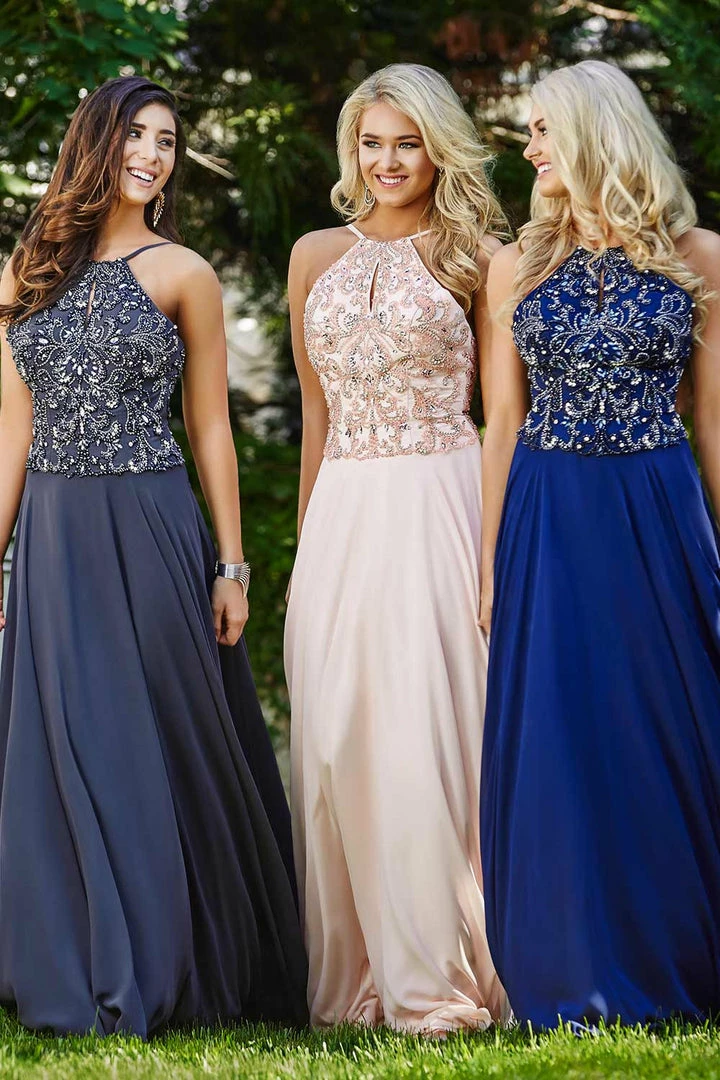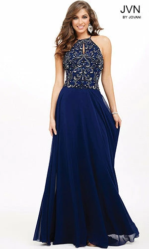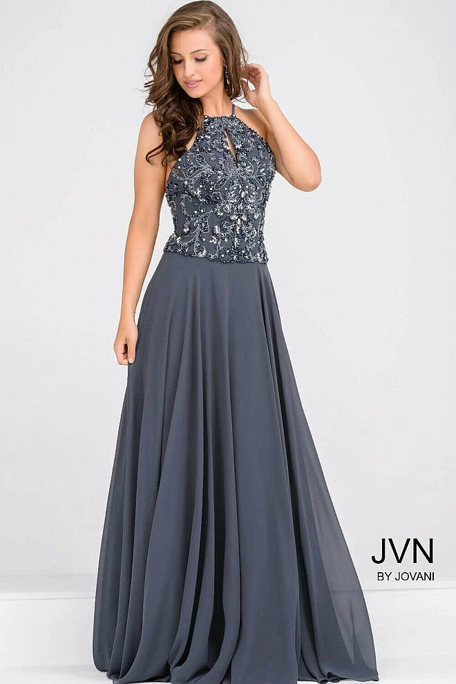 JVN by Jovani JVN33700 Β Halter Chiffon Long Gown Beaded bodice with small keyhole front A line prom dress. Formal Gown High Neckline