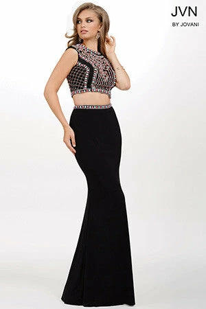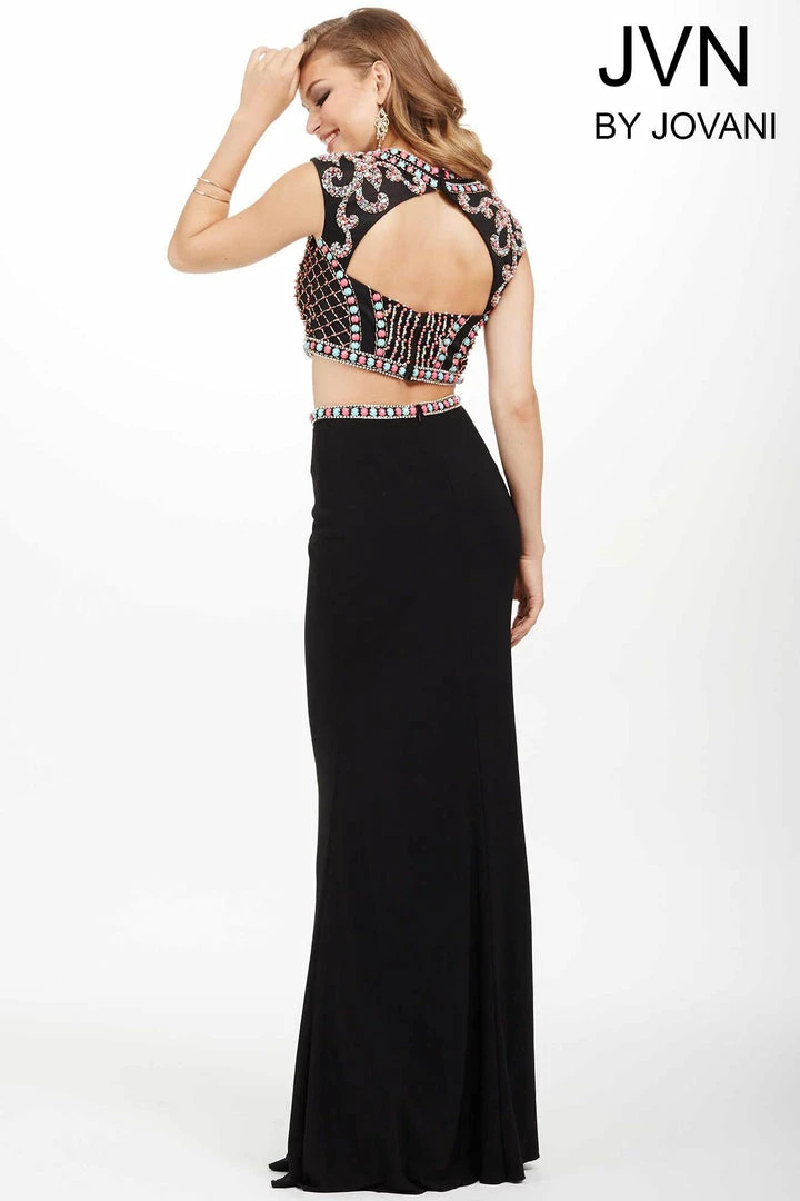 JVN by Jovani style JVN34015 Sexy two piece prom dress features sleeveless multicolored coral and mint beaded top with cutout back and a fitted jersey skirt. Two Piece Beaded Prom Dress High Neck Formal Gown JVN 34015. Fun and flirty two-piece prom dress features a sleeveless top with multicolored beaded embellishments and a fitted jersey skirt